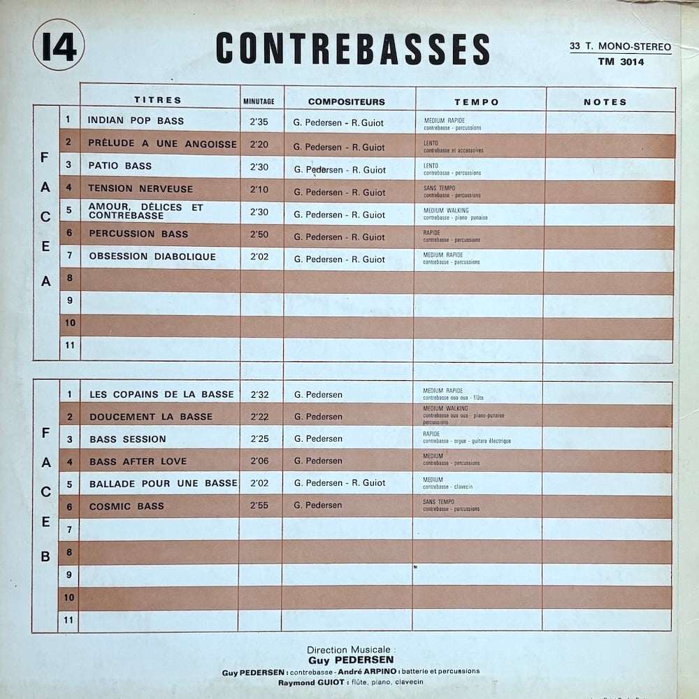 This LP leans more toward a moody jazz album than a typical library record, infused with dark, atmospheric psychedelic jazz, as heard on “Percussion Bass”, "Ballade pour une Basse" and “Patio Bass.” The highlight is undoubtedly the psych-jazz cut “Les Copains De La Basse,” featuring an insane flute solo, slapping double bass, and massive drums. “Bass Session” is another heavy organ-driven psych tune, building to a crazy, hectic climax.